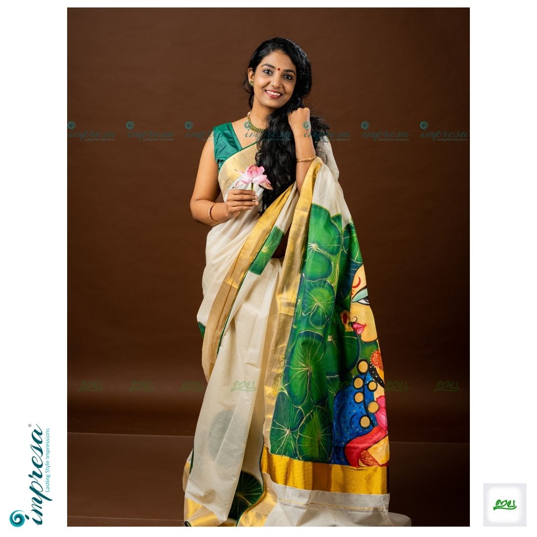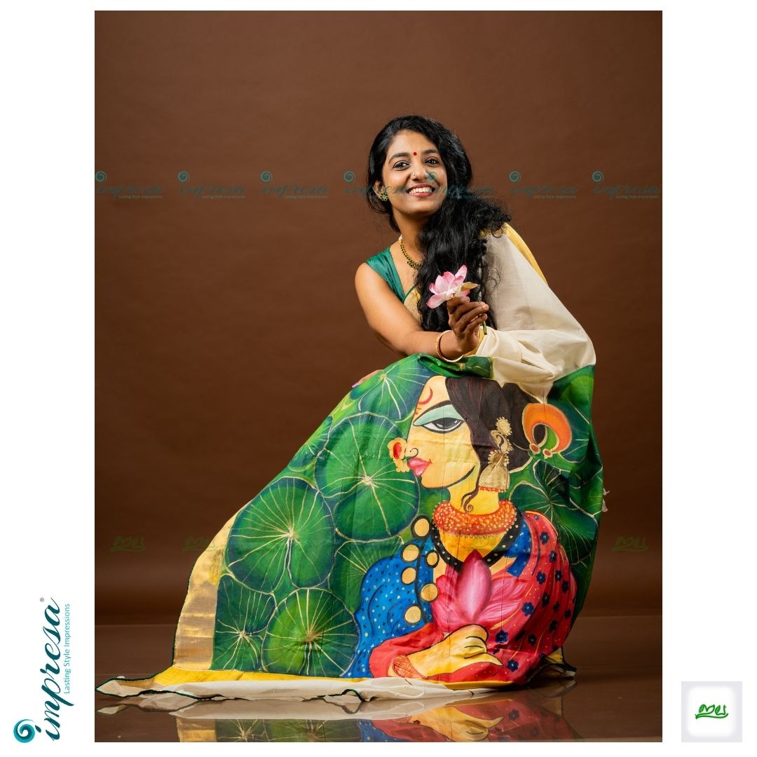 Handpainted Lotus Lady Design Kerala Cotton Kasavu Saree
