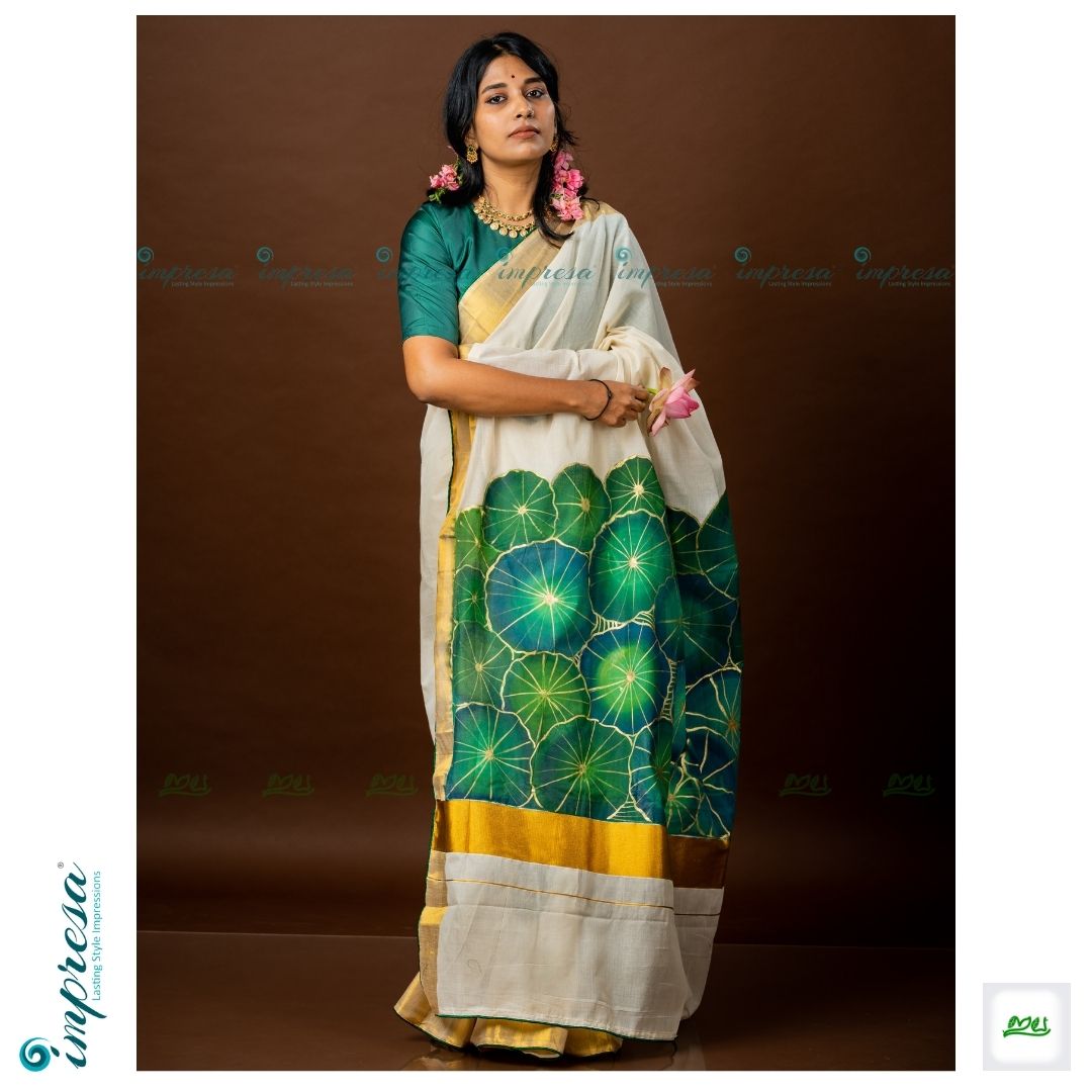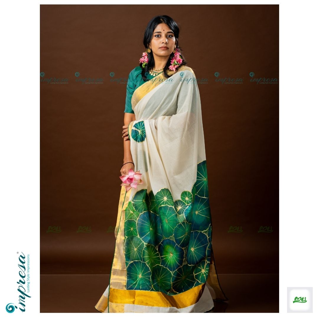 Handpainted Lotus leaves Design Kerala Cotton Kasavu Saree
